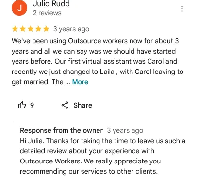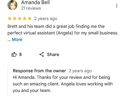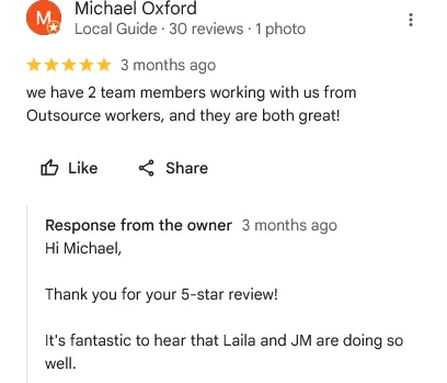 We hold consistent regular check-ins and ongoing performance reviews to ensure continuous improvement and identify opportunities to scale your support.